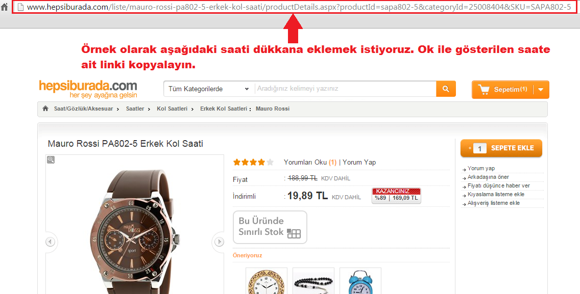 4- Örnek ürün olarak saati seçtik. Saatin linkini resimdeki gibi kopyalayın.