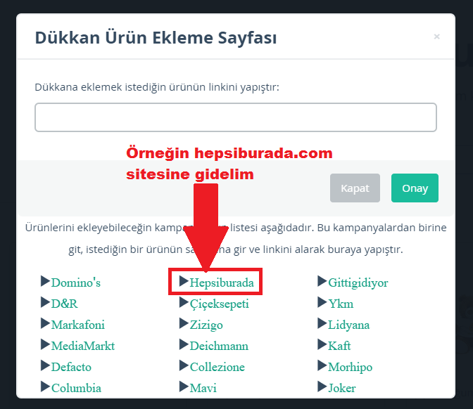 3- Ürün ekleme sayfasına geldiğinizde aşağıda listelenen mağazalardan ürününü eklemek istediğiniz mağazaya tıklayın. Örnek olarak hepsiburada.com seçildi.